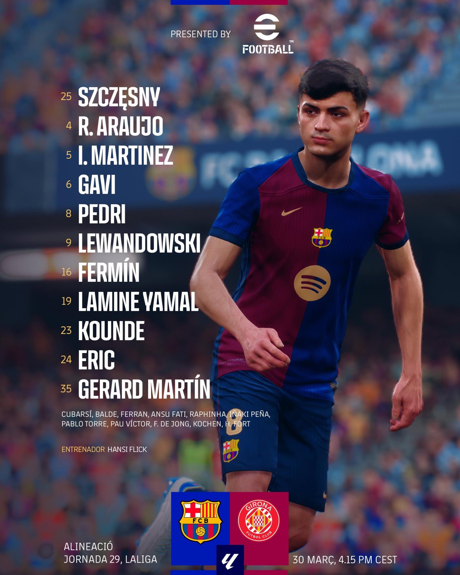 巴薩首發(fā):25-什琴斯尼、4-阿勞霍、5-伊尼戈-馬丁內斯、23-孔德、24-埃里克-加西亞、35-杰拉德-馬丁、6-加維、8-佩德里、16-費爾明、19-亞馬爾、9-萊萬