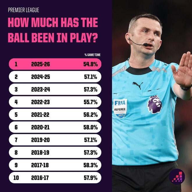 如今比賽時長確實有所增加,賽事為打擊拖延時間行為,會在每場比賽末尾加入更長補時,但球迷看到的實際比賽(有效控球)時間,仍幾乎低于近年任何一個賽季。